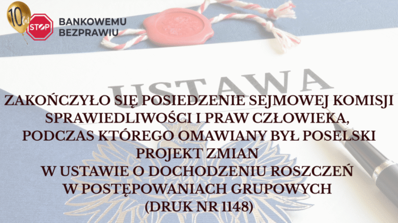Na posiedzeniu Komisji Sprawiedliwości i Praw Człowieka, zaplanowanym w związku z poselskim projektem ustawy o zmianie ustawy o dochodzeniu roszczeń w postępowaniach grupowych (druk nr 1148), nie doszło do pierwszego czytania projektu – z uwagi na ograniczenia czasowe jakie miała komisja.